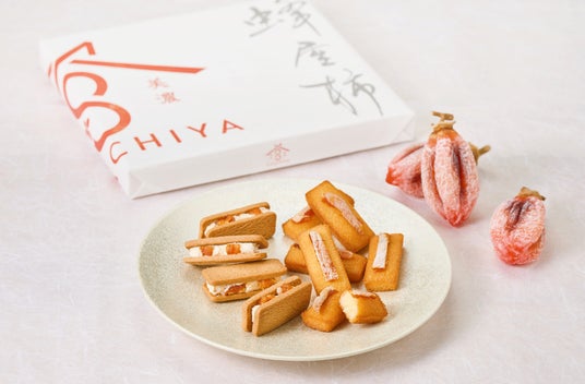 ホワイトチョコと細かく刻んだ干し柿を練り込んだコクのあるバタークリームを、しっとりと焼き上げたクッキーでサンドしました。口当たりの良いクリームになるよう改良しました。仕上げに果肉の食感をしっかりと味わえるサイズの蜂屋柿をトッピングしています。
