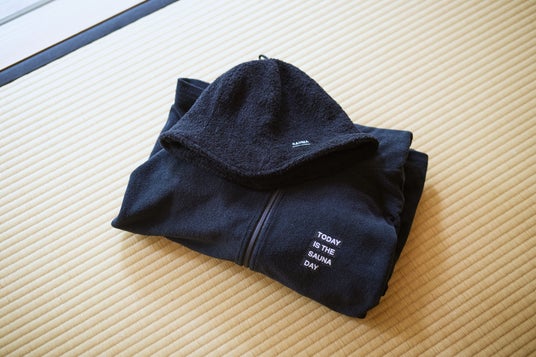 テントサウナは着脱が多いため、サウナキャンプがオリジナルで製作した、 便利なフルジップ式のタオルポンチョを採用しています。しゃがまなくてもジッパーを上げ下げできるように、少し短めのジッパーで前面にスリットが確保されるので歩きやすい。「心地よい肌触り」と「乾きやすさ」でふんわりとしたタオルに近い仕上がりで、サウナ体験をより快適にお過ごしいただけます。