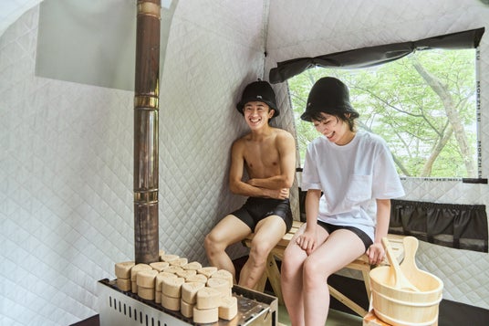 解放感溢れる自然の中に立つプライベートテント内では、自然と調和するサウナドロップをグループごとに自由に愉しむことができます。また、一般的なサウナは男女別であることがほとんどのため、カップルやご夫婦一緒の空間で愉しむことはできませんが、テントサウナはプライベート空間なので、性別を問わず、親しい方とサウナを満喫することができます。