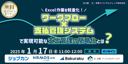 各社との共催で、2025年1月17日(金)に無料セミナー「エクセル作業を軽量化!ワークフロー×支払管理システムで実現可能な支出管理の簡略化とは?」を開催いたします。