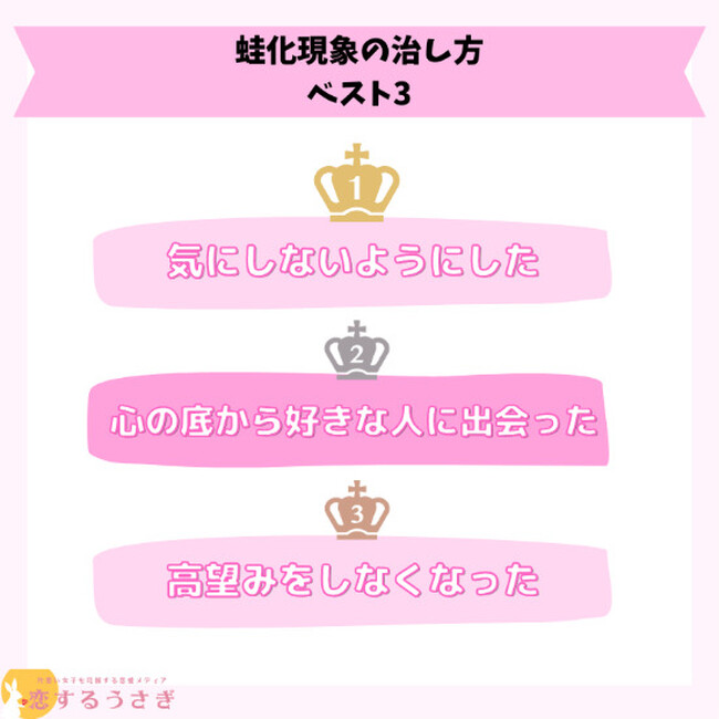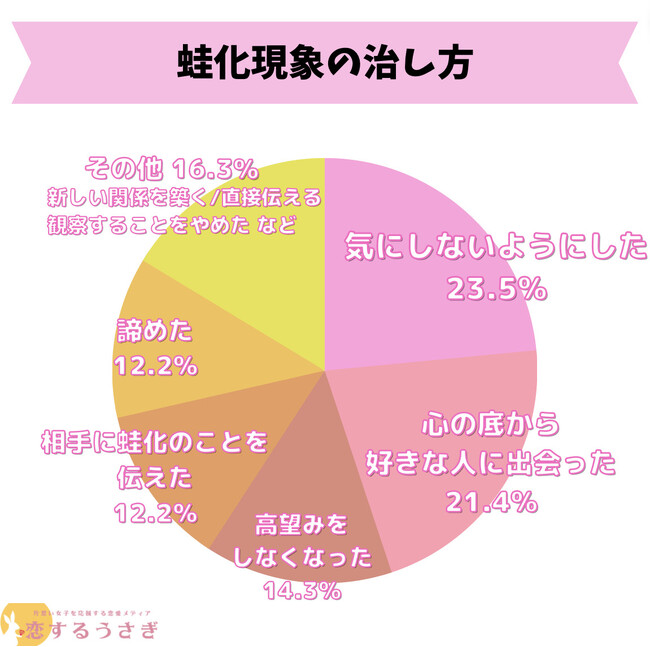 恋するうさぎ編集部が行った『蛙化現象の治し方』のアンケートによると1位:気にしないようにしたが23.5%、心の底から好きな人に出会ったが21.4%、高望みをしなくなったが14.3%という結果になりました。