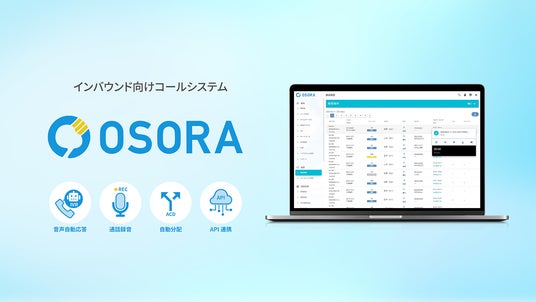 OSORAは電話業務をより効率化する、インバウンド向けコールシステムです。API連携により、システムの拡張性が高く、CRMや他のツールと連携することが可能です。全通話録音やIVR(音声自動応答)、着信ポップアップ、分析機能など、インバウンドに必要な豊富な機能を搭載しています。