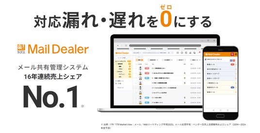 メールディーラーは、info@やsupport@などの代表アドレスやメーリングリストでのメール対応の管理をラクにするクラウド型のメール共有・管理システムです。
