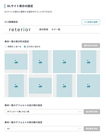 また、DLサイト表示の設定では、サイトのロゴや素材一覧のレイアウト、デフォルトの並び順・表示数をそれぞれ設定することが可能です。