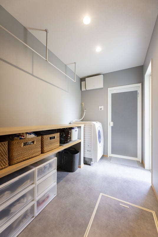 グレーとベージュを組み合わせた明るい印象のランドリールームには、作業カウンター・造作収納棚・ハンガーパイプを計画。洗濯関連の家事を1つのスペースで完結することができる家事ラクな空間です。