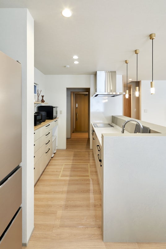 全館空調を搭載していることで、どの部屋も同じ温度に保つことが可能。その特性を生かし、建具を可能な限りなくすことで、玄関からリビングやパントリー・キッチンまで直接繋がる開放的な間取りにしました。