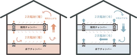 床下や階間に空気が流れるので、空調室を必要とせず理想の間取りデザインが可能。