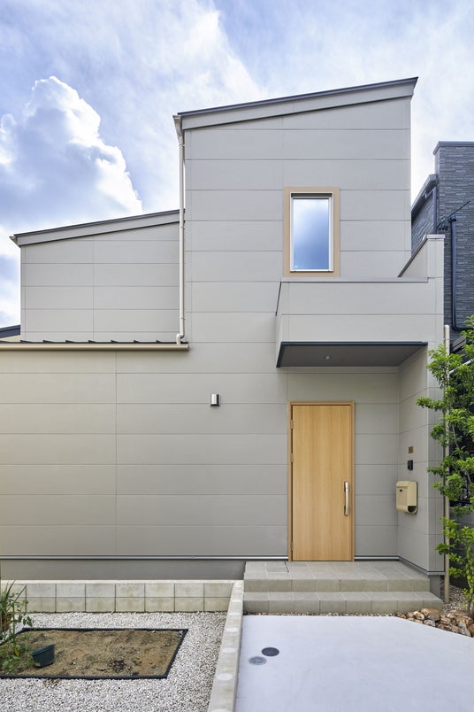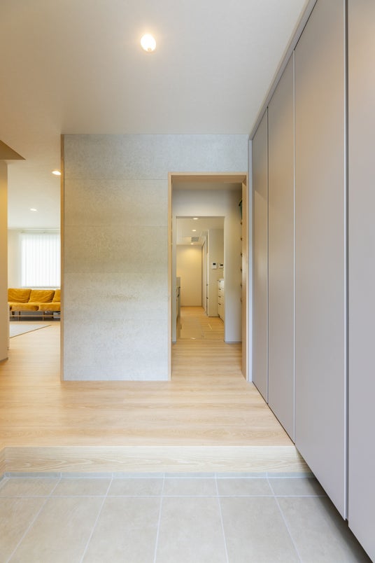 外観・内観共に、グレージュとあたたかみのあるライトブラウンを基調にしたナチュラルモダンのお家です。玄関には異素材の木枠を組み合わせることで施主様のこだわりが感じられます。