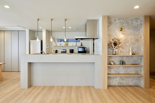 キッチン横に造作した収納棚はラスティックな石目をデザインしたクロスを採用することで、まるでディスプレイのようなおしゃれ空間に。