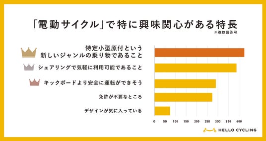 「電動サイクル」で特に興味関心がある特長は、「特定小型原付という新しいジャンルであること」が最も多くおよそ400人、「シェアリングサービスで気軽に利用できること」がおよそ380人という結果となりました。