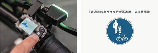 車道専用モード(最高速度20km/h)と歩道可モード(最高速度6km/h)を選択できるボタンを搭載しています。「電動サイクル」は原則車道を走行する必要があります。通行が許可されている歩道に限り「歩道可モード」で通行できます。歩道可モード(最高速度6km/h)は、「普通自転車及び歩行者等専用」の道路標識等が設置されている歩道に限られます。