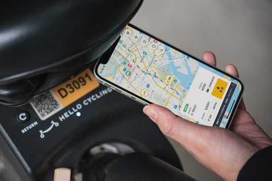 6. 「HELLO CYCLING」アプリや車両に搭載されているスマートロックのQRの読み取りで「電動サイクル」の予約を行い、アプリの「解錠」ボタンからスマートロックを解錠する(※11)