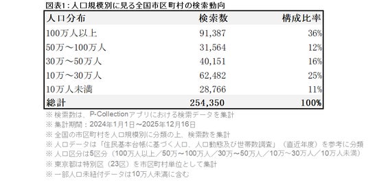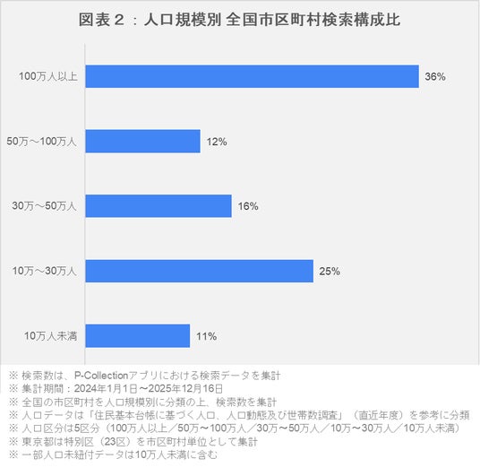 パーキングサイエンス株式会社(本社:神奈川県藤沢市、代表取締役:井上直也)は、自社が運営する【無料】ポイ活機能付き駐車場検索アプリ「P-Collection」にて得られた、2024年1月から2025年12月16日までの約2年間、約25万件の駐車場検索データをもとに、全国の市区町村を人口規模別に分類し、駐車場検索数および構成比を分析しました。