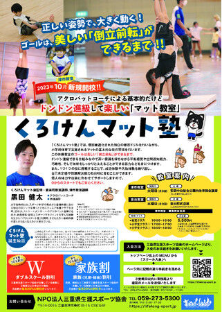 特定非営利活動法人三重県生涯スポーツ協会(三重県津市、理事長 竹田昌平)とアクロバットコーチの黒田健太(三重県桑名市)が開発した「美しい倒立前転」ができることをゴールとした未経験者・初心者向けマット教室「くろけんマット塾」の2号店を津市安濃町の安濃中央総合公園内体育館で開校することが決まりましたのでお知らせします。