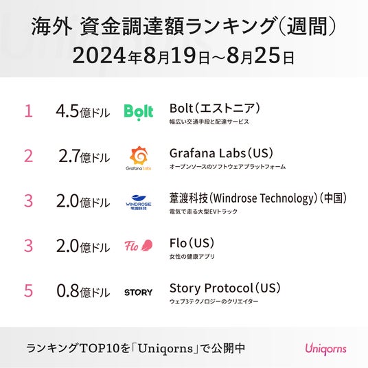国内最大級のスタートアップメディア「Uniqorns(ユニコーンズ)」が2024年8月19日~8月25日のグローバルスタートアップ資金調達状況をランキング形式で発表