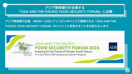 Green Carbon株式会社(代表取締役:大北潤、以下Green Carbon(読み;グリーンカーボン))はこの度、アジア開発銀行(Asian Development Bank、以下ADB)主催、4月9日~12日にフィリピン(マニラ)で開催される「ASIA AND THE PACIFIC FOOD SECURITY FORUM」のイベントに出展することをお知らせします。