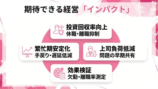 - 3カ月後に欠勤・離職率・プレゼンティーズム等で効果検証し、次年度へ反映