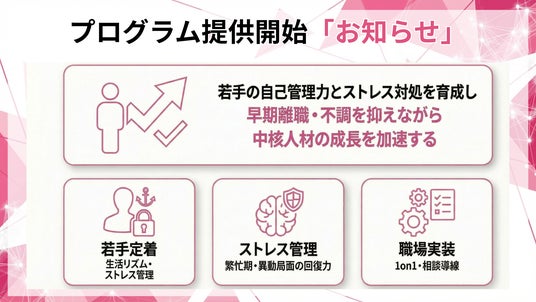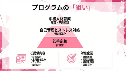 本プログラムは、若手社員の自己管理力とストレス対処を業務行動として標準化し、繁忙期や異動・評価局面の不調と早期離職を抑えながら、中核人材の成長を加速する階層別研修です。