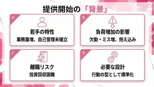 企業側に必要なのは、若手の離脱が起きやすい局面(繁忙期、異動、評価前後、プロジェクト立上げ)を前提に、自己管理とストレス対処を「行動の型」として標準化し、相談行動と職場運用まで含めて定着させる設計です。