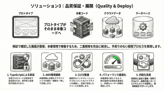 - TypeScriptによる型安全なプロコード: 保守性と拡張性を完全担保し、長期運用に耐える品質