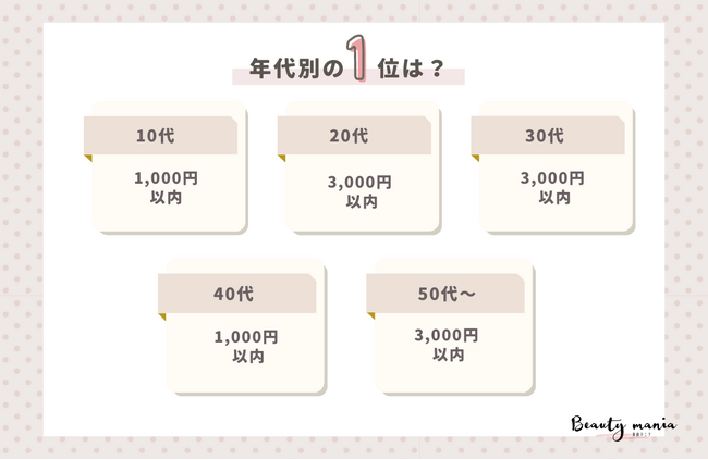 「3,000円以内」と回答した理由として、「化粧水や乳液、美容液と使うと月平均このくらいになる」といった意見が数多く見受けられました。スキンケアアイテムの中でも化粧水はお値段を抑えて、美容液は少し予算を上げて・・と全体で調整しているという声も。