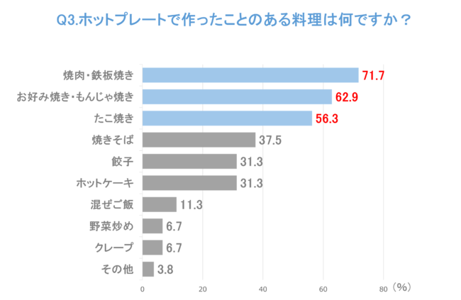 ホットプレートを所持している人に実際に作ったことのある料理について尋ねると、「焼肉・鉄板焼き」「お好み焼き・もんじゃ焼き」「たこ焼き」の順で作ったことのある人が多い結果となったことから、ホットプレートを食卓で囲みながら、複数人で料理を楽しむような活用方法に強い人気があることが分かりました(下図Q3参照)。