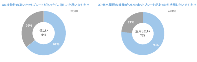 以上の結果に対して、「機能性の高いホットプレートがあったらほしいと思いますか?」と尋ねたところ、欲しいと答えた人は全体の64%に上りました。収納や手入れなどの扱いやすさを叶えながらも、毎日の食卓がよりバリエーション豊かになることに対して需要を感じる人が多いと考えられます。さらに、水を使わず食材の水分のみで調理を行う「無水調理」機能に関しても、ホットプレートの機能として「活用したい」と答える人が全体の76%という結果に。クオリティの高いメニューを、家族や友人と食卓を囲みながら気軽に調理することができるホットプレートは、フライパンや鍋に代わるニューノーマルな調理家電として活躍することも考えられます。