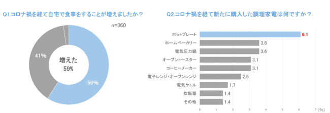 調査によると、20~49歳の女性360名のうち、全体の約6割がコロナ禍を経て「自宅で食事をすることが増えた」と回答(下図Q1参照)。コロナ禍により外出自粛傾向が強まったことで、外食ではなく自宅で食事を楽しむことが優先されるようになり、さらにはそのスタイルが定着化していることがわかります。