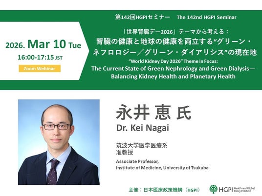 特定非営利活動法人 日本医療政策機構(HGPI: Health and Global Policy Institute)(所在地:東京都千代田区、代表理事:乗竹 亮治)は、2026年3月10日(火)に第142回HGPIセミナー「『世界腎臓デー2026』テーマから考える:腎臓の健康と地球の健康を両立する“グリーン・ネフロロジー/グリーン・ダイアリシス”の現在地」を開催します。