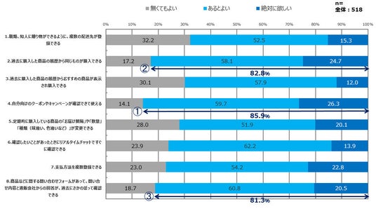 マイページがなにかわからない/あてはまるものはない、と回答した対象を除く方々にマイページの機能の「要・不要」の度合いを聞いたところ、「要=あるとよい+絶対に欲しい」を合算した数値でトップとなったのは「自分向けのクーポンやキャンペーンが確認できて使える」で、絶対に欲しいと回答した数値も最も高くなりました(26.3%)。次点は「過去に購入した商品の履歴から同じものが購入できる」、3番めは「商品などに関する問い合わせフォームがあって、問い合わせ内容と通販会社からの回答が、過去にさかのぼって確認できる」という結果になりました。