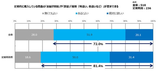 参考までに、以下のグラフは「定期的に購入している商品の「お届け間隔」や「数量」「種類(味違い、色違いなど)」が変更できる」の項目について、全体と定期便利用者のみを対比したものです。