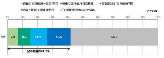 この質問も、ECを含む通販利用経験者全員を対象としています。過去に定期便を利用したことがある、今現在も定期便を利用している、と回答したのは4割強(41.8%)。そのうち、今現在「定期便」を利用しているのは26.7ポイントで通販経験者の4人に1人が現在進行形となっています。