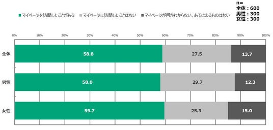 回答者全体でマイページを訪問したのは約6割(58.8%)、訪問したことがないは3割弱(27.5%)となりました。男女の性差で、数値は極端に変わりませんでした。