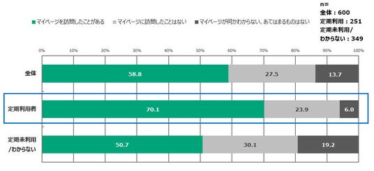 この後に記載する「商品を定期的に購入した/している」という定期便利用者にフォーカスしてみると、約7割が「マイページを訪問したことがある」と回答し、利用率が全体より高い数値となりました。定期的に商品が届くこともあり、何らかの理由でマイページを訪問することが多くなっている実態が見えてきます。一方、定期購入したことがない/わからない回答者の訪問率は全体に比べて8.1ポイント低く、「マイページが何かわからない」という回答も2割弱(19.2%)と高い数値となりました。