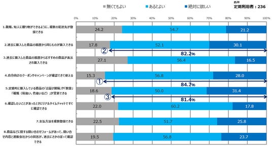 マイページの機能の「要・不要」の度合いを、定期便利用者のみに絞って集計したところ、すべての項目で「絶対に欲しい」の数値が増加し、要(=あるとよい+絶対に欲しい)のトップと2番目の項目は変わらなかったものの、3番目に「定期的に購入している商品の【お届け間隔】や【数量】【種類(味違い/色違いなど)】が変更できる」がランクインしました。さらに、この項目は絶対欲しいの中でトップの数値(31.4%)となりました。