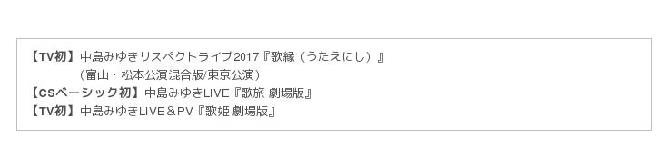 CS放送ファミリー劇場(運営:株式会社ファミリー劇場、所在地:東京都港区赤坂、代表取締役社長:服部洋之)は、本日2月19日(日)にオーチャードホールで行われた、中島みゆきを敬愛する稀代のアーティストたちによる、中島みゆきの名曲だけで構成されるコンサート「中島みゆきリスペクトライブ2017『歌縁(うたえにし)』」の東京公演及び1月に行われた富山、松本公演の混合版を、4月にTV初放送致します。さらに、中島みゆき自身のライブコンテンツ『歌旅 劇場版』、『歌姫 劇場版』を合わせて放送。日本の音楽シーンを牽引する歌姫・中島みゆきの名曲たちを、こころゆくまで堪能できる2カ月間の特集としてお届け致します。