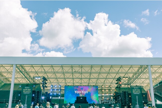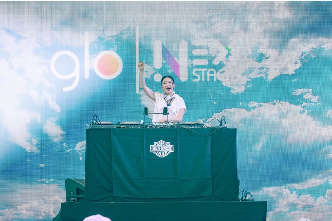 メインステージの「BLUE SKY STAGE」は、block.fmとglo(TM)によるコラボプロジェクト「glo(TM) NEX STAGE」とコラボしたDJパフォーマンスからスタート。フジロックなど大型フェスにも出演するDJ/アーティストのYonYonがオープニングアクトを飾り、爽快な青空のもと、ゆったりとのれるR&Bからアグレッシブなヒップホップまで縦横無尽にプレイし、続々と会場に到着する観客を出迎えます。「Beautiful Woman」や「mirror(選択)」といった自身の楽曲では自らマイクを持ち歌声を披露し、ステージ前に集まった観客を魅了していました。