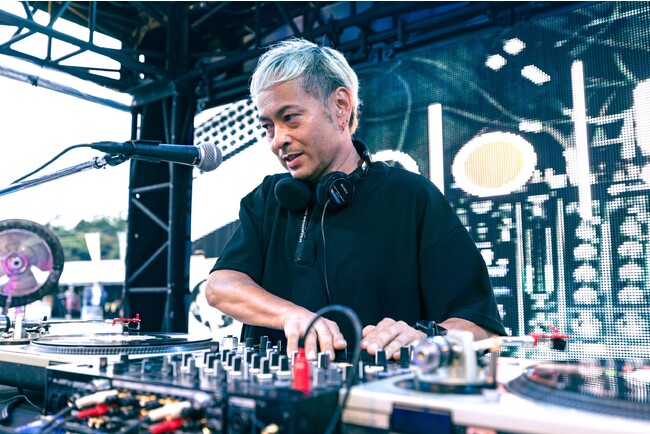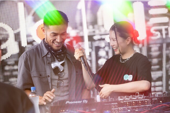 強い日差しが会場を照りつける中、レゲエサウンドでパフォーマンスをスタートしたのは、トッププロデューサーの☆Taku Takahashi(m-flo, block.fm)。ヒップホップ、EDM、テクノ、ジャージークラブと、踊れるオールジャンルミックスで会場を大いに沸かせます。m-flo loves MINMI「Lotta Love」や宇多田ヒカル「Gold ~また逢う日まで~」の☆Taku Remixがかかると、観客の熱気も最高潮に。参加者が会場の至る所で自由に踊り音楽を楽しむ姿が印象的でした。