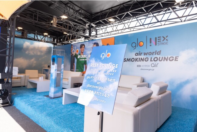 今回の「BLUE SKY HEAVEN 2023」目玉のひとつは、glo(TM)がプロデュースした体験型喫煙ブース「air world SMOKING LOUNGE 」。爽やかな青空のパネルが目を引くブースはパラソルやミストなども設置されており、暑いなか涼を求める人で朝早くから賑わいを見せていました。