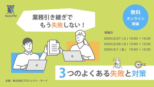 株式会社プロジェクト・モードが提供するナレッジマネジメントSaaS「NotePM ( https://notepm.jp )」は、オンラインセミナー『業務引き継ぎでもう失敗しない!3つのよくある失敗と対策 』を開催いたします。
