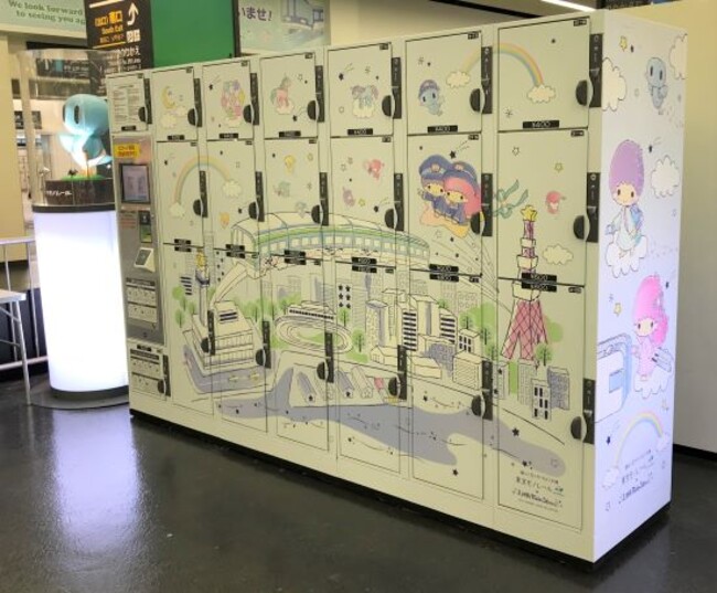 モノレール浜松町駅中央改札外のコインロッカーを、キキ&ララが東京モノレール沿線を空から眺めている、かわいらしいデザインでラッピングしています。フォトスポットとしてもお楽しみください。