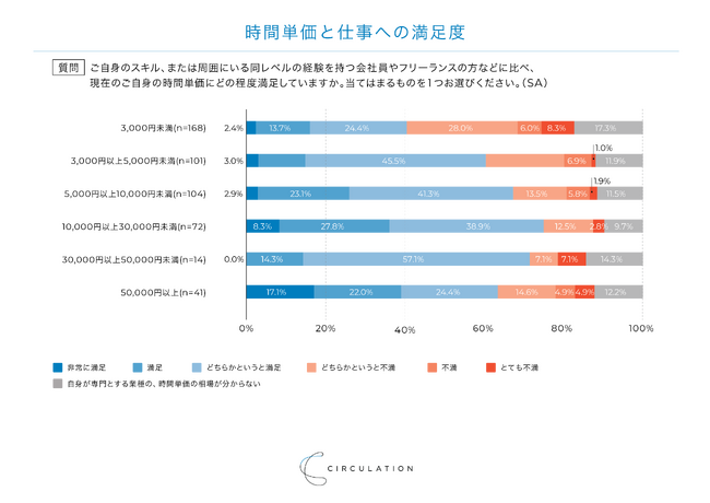 全体的に、時間単価が高いほど、仕事自体への満足度も上がる傾向にあります。ただし、時間単価3,000円未満の人は顕著に仕事への満足度が高くなく、時間単価30,000円以上になると仕事に不満を持つ人の割合も再び増えていました。