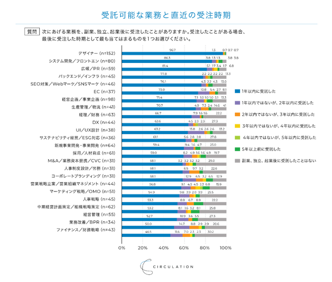 過去1年間での受注実態を探ると、最も多かった分野は「デザイナー(96.7%)」「システム開発/フロントエンド(86.3%)」「広報/PR(81.4%)」でした。しかし、少数派の「ファイナンス/財務戦略(46.5%)」や「業務改善/BPR(50%)」「経営管理(52.7%)」も見逃せません。頻度が低い分野も決して不人気ということではなく、少数の個人にニーズが集中しやすかったり、それほど頻繁に発生するニーズではないことなどが要因として考えられます。