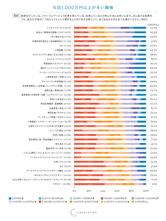 各職種の今年度の想定年収を分析すると、M&Aや中期経営計画策定など、経営戦略への理解が必要な職種に携わる者ほど、年収1,000万円以上の割合が高まっています。また17名しか回答者がいないとはいえ、インサイドセールスも非常に年収が高い結果となりました。逆に、EC、デザイナー、広報/PRは年収300万円以下が目立ちます。この傾向は昨年と変わらず、同条件のランキングではM&A/業務資本提携/CVC、人事戦略、新規事業開発・事業開発の順で年収が高いことが示されていました。
