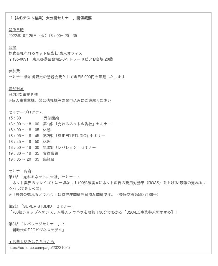 D2C(※1)支援事業やEC基幹システム「ecforce」(イーシー・フォース)を提供する株式会社SUPER STUDIO(所在地:東京都目黒区、代表者:代表取締役 林 紘祐、以下:SUPER STUDIO)は、EC/D2C事業者を対象に、「D2C(ネット通販)」×「広告」に特化したクラウドサービスおよびコンサルティングサービスを提供する株式会社売れるネット広告社(所在地:東京都港区、代表者:代表取締役社長 CEO 加藤公一レオ、以下:売れるネット広告社)と共に「【A/Bテスト結果】大公開セミナー」を10月25日(火)に開催いたします。SUPER STUDIOと売れるネット広告社は本年7月28日(木)より協業を開始しており、今回は協業を記念した第1弾のセミナーとなります。