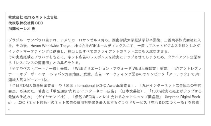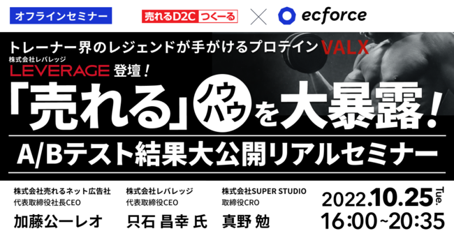 本セミナーでは、売れるネット広告社 代表取締役社長CEO 加藤公一レオ氏とSUPER STUDIO 取締役CRO 真野勉より、EC/D2C事業の売上最大化につながる最先端のノウハウをお伝えいたします。また、プロテインやサプリメントを展開するフィットネスブランド「VALX」で急成長中の株式会社レバレッジ 代表取締役 CEO 只石昌幸氏をお迎えし、SNS戦略や事業成長の秘訣など、具体的な事例も交えお話いただきます。