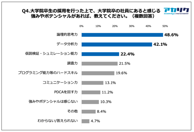 「Q4.大学院卒生の採用を行った上で、大学院卒の社員にあると感じる強みやポテンシャルがあれば、教えてください。(複数回答)」(n=107)と質問したところ、「論理的思考力」が48.6%、「データ分析力」が42.1%、「仮説検証・シュミレーション能力」が22.4%という回答となりました。