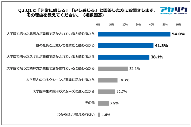 Q1の「Q1.あなたは、お勤め先の採用活動において、大学院卒生を採用してよかったと感じますか。」の問いに対し、「非常に感じる」「少し感じる」と回答した方に、「Q2.その理由を教えてください。(複数回答)」(n=63)と質問したところ、「大学院で培った思考力が業務で活かされていると感じるから」が54.0%、「他の社員と比較して優秀だと感じるから」が41.3%、「大学院で培ったスキルが業務で活かされていると感じるから」が38.1%という回答となりました。