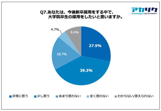 「Q7.あなたは、今後新卒採用をする中で、大学院卒生の採用をしたいと思いますか。」(n=107)と質問したところ、「非常に思う」が27.9%、「少し思う」が39.3%という回答となりました。