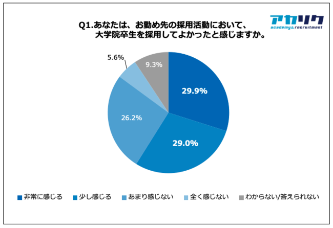 「Q1.あなたは、お勤め先の採用活動において、大学院卒生を採用してよかったと感じますか。」(n=107)と質問したところ、「非常に感じる」が29.9%、「少し感じる」が29.0%という回答となりました。